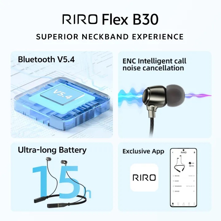 Model RIRO Flex B30 Bluetooth Version V5.4 (Latest) Battery Life Up to 20 Hours (Standby: 150H) Charging Time Approx. 2 Hours Charging Port USB Type-C Noise Cancellation ENC (For Calls) Weight 24g (Ultra-Light) Wireless Range 10 Meters Driver Unit High-Fidelity Dynamic Drivers Water Resistance Sweat & Splash Resistant